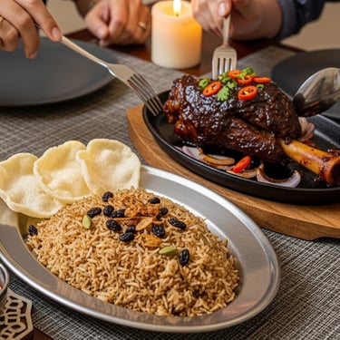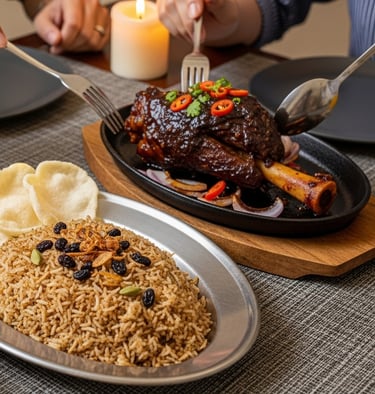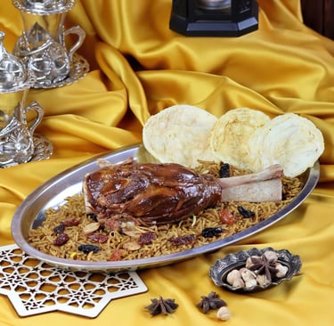 "Feel the Harmony: A Sumptuous, Melt-in-Your-Mouth Lamb Shank, Perfectly Paired with a Masterpiece of Kebuli Rice."