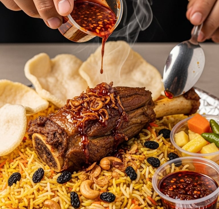 Rice, Juicy Lamb shanks, pickles, chips, sambal, raisins, cashews, fried shallots, spoon More portions