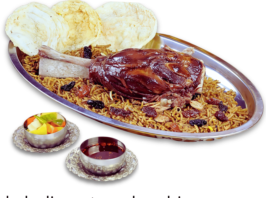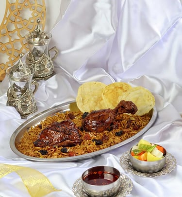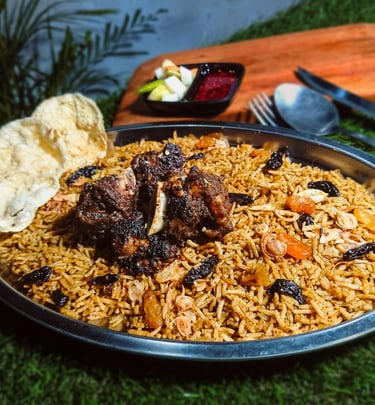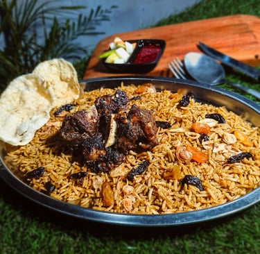 Kebuli rice with a distinctive middle eastern aroma sprinkled with raisins, fried onions served with a wide selection of soft and rich side dishes. plus fresh pickles and abu ali's special chili oil dip makes it even more delicious and add more.
