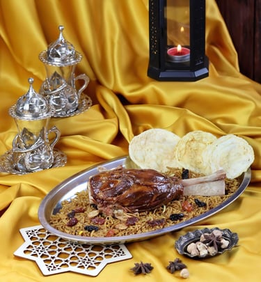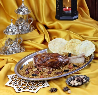 "Feel the Harmony: A Sumptuous, Melt-in-Your-Mouth Lamb Shank, Perfectly Paired with a Masterpiece of Kebuli Rice."