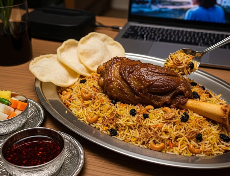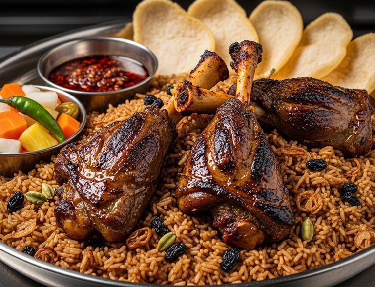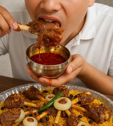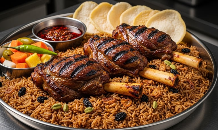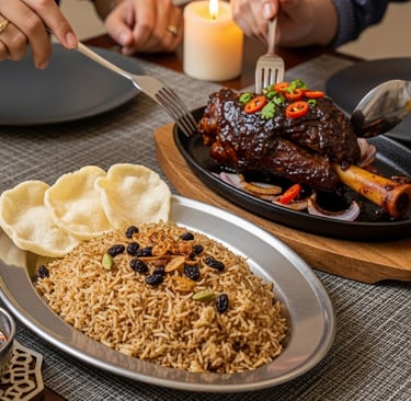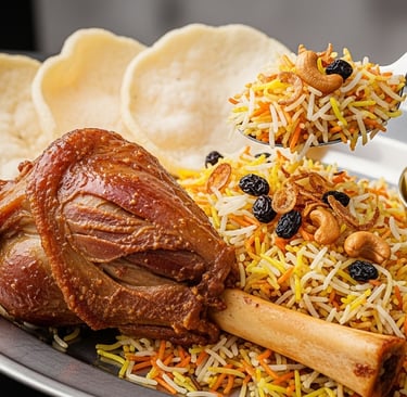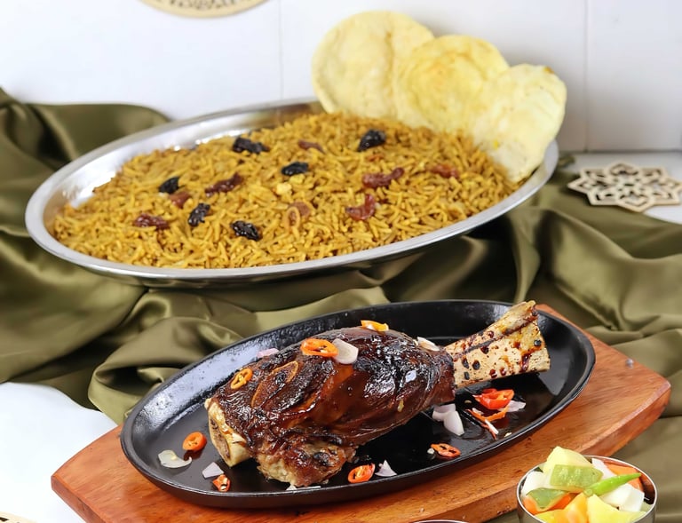 "Feel the Harmony: A Sumptuous, Melt-in-Your-Mouth Lamb Shank, Perfectly Paired with a Masterpiece of Kebuli Rice."